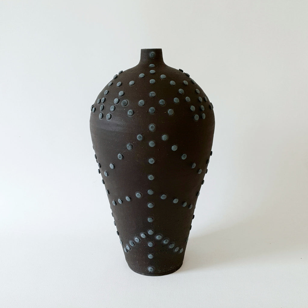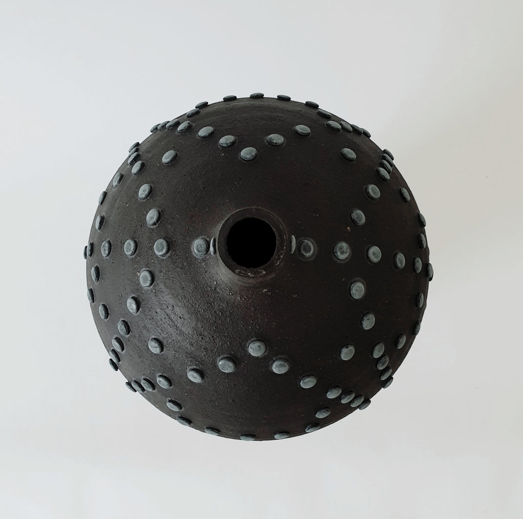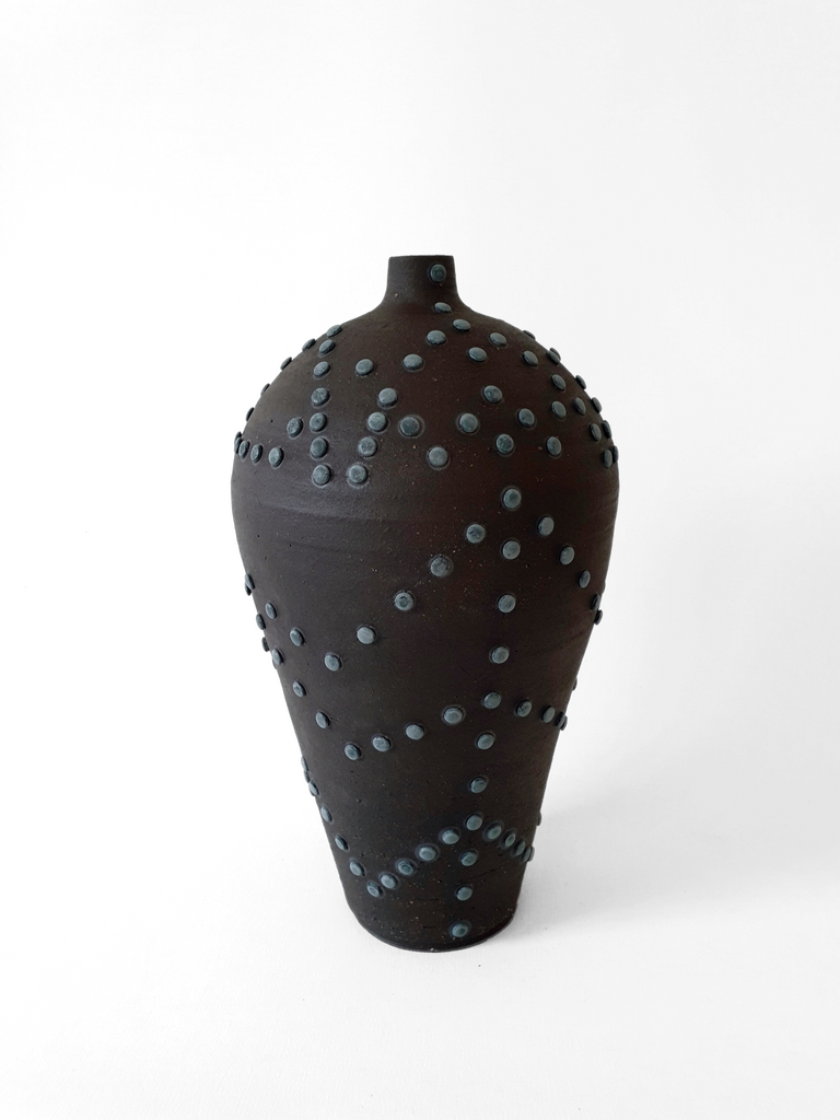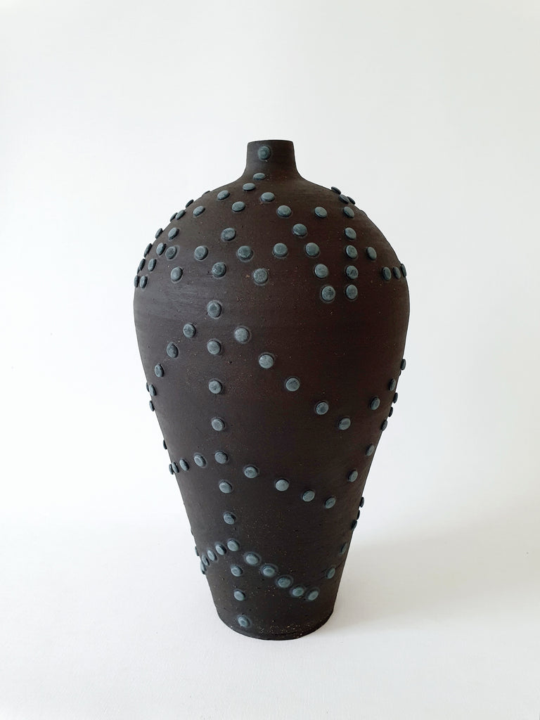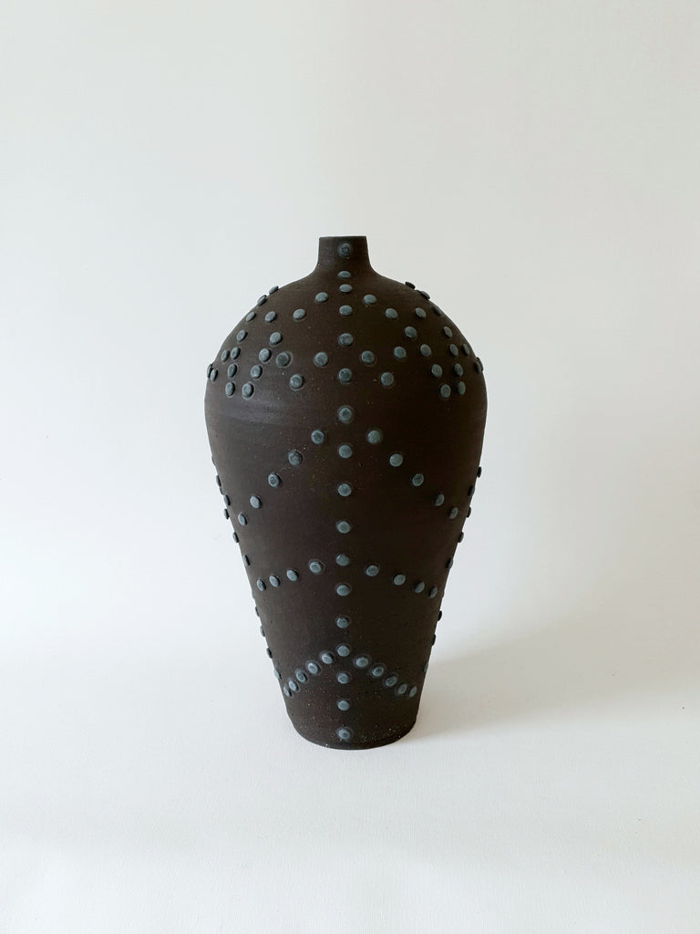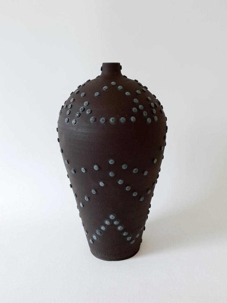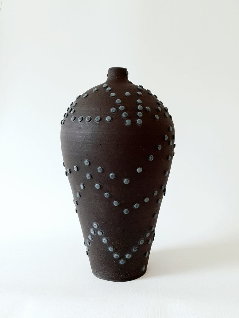 Wheel thrown black stoneware. Unglazed interior and exterior (please note: For decorational purpose only, not waterproof.) Embedded with metal studs in a pattern inspired by ancient African tribal art. One of a kind, Special Edition.